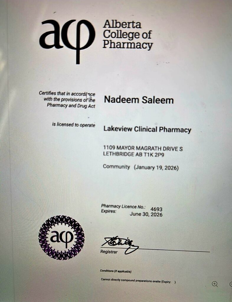 Lakeview Clinical Pharmacy in Lethbridge provides trusted, professional healthcare for the local community. Our services include prescription refills, delivery, immunizations, and expert advice from licensed pharmacists. We are committed to making healthcare accessible, reliable, and convenient, ensuring every patient receives personalized support and guidance. From home delivery to specialized care, Lakeview Clinical Pharmacy in Lethbridge healthy, safe, and well-informed.